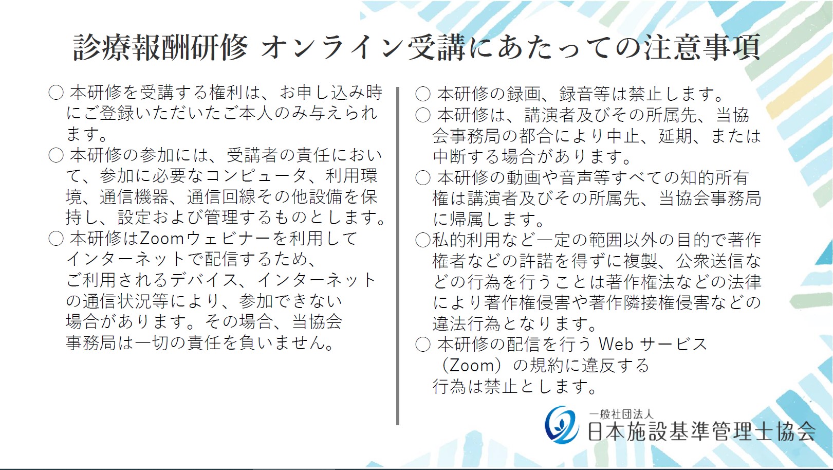 ※会員(施設基準管理士)は、原則として申し込みフォームの送信をもって申し込み完了となりますが、定員のため参加方法の変更を当協会事務局より依頼する可能性がございます。ご了承ください。