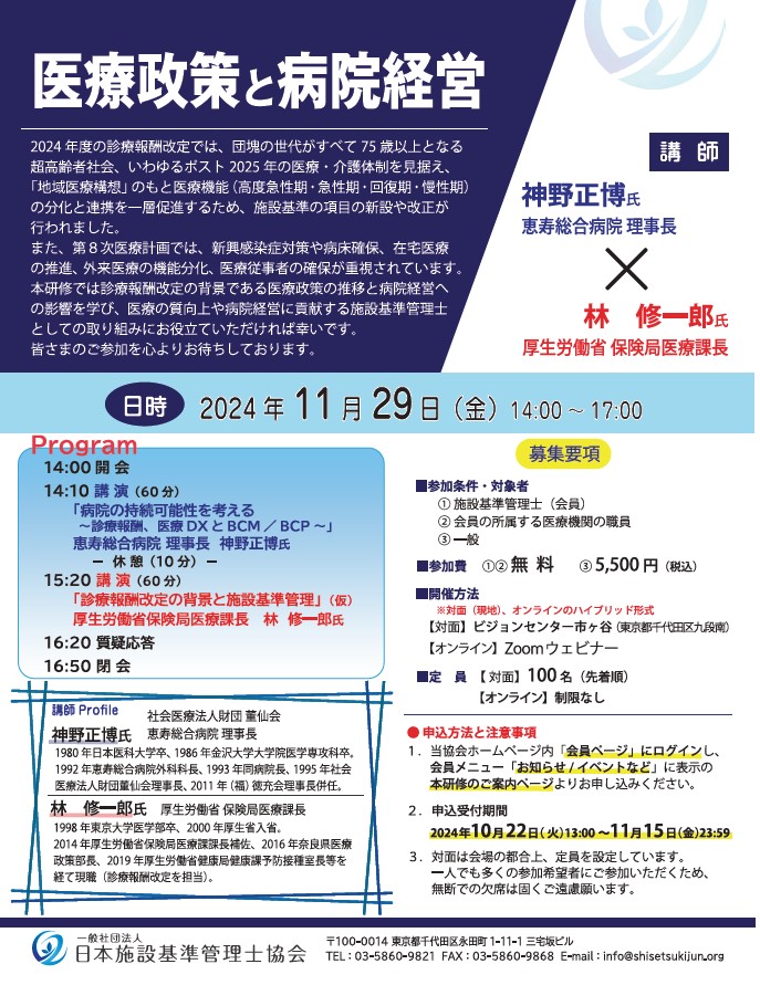 参加対象 | 施設基準管理士(会員)/会員所属施設の職員/一般 |