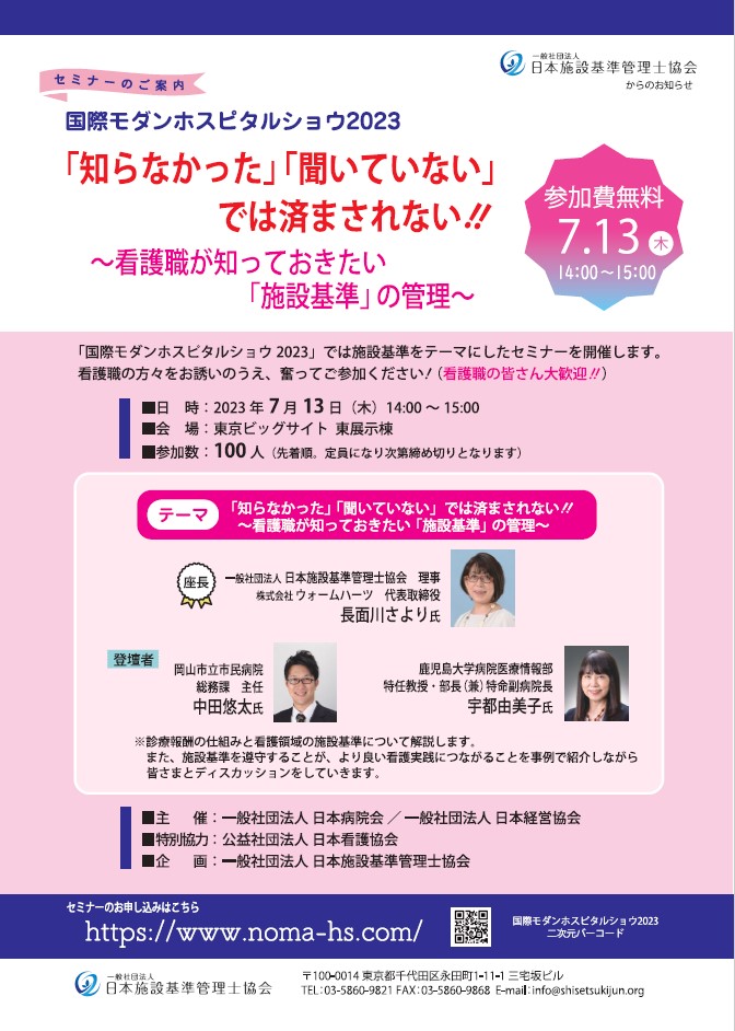 国際モダンホスピタルショウ2023では、施設基準をテーマに以下のセミナーが開催されます。