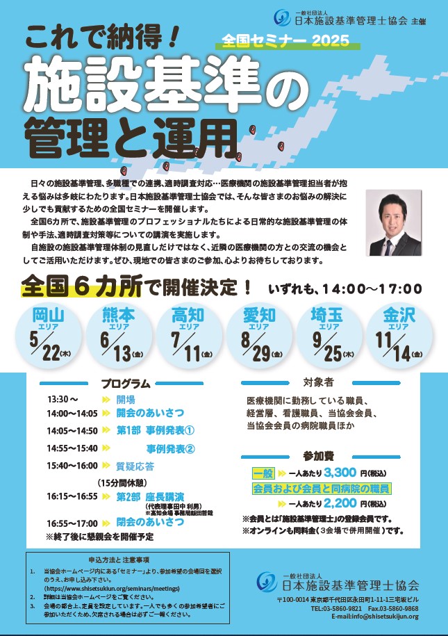 日常的な施設基準管理の体制や手法、適時調査対策等についての講演を実施します。